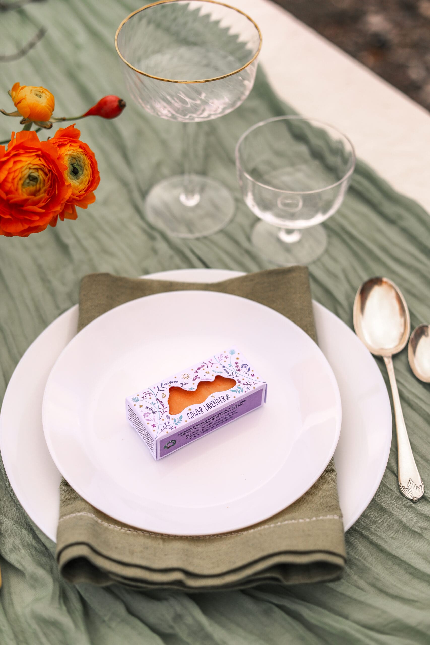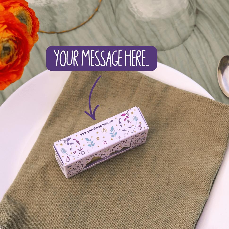 We’ve wrapped our handmade, eco lavender soaps in beautiful white boxes with a delicate floral pattern, which you can personalise with your names, your wedding date or a message to your guests. You can say thank you to the people who mean the world to you with a wedding keepsake that’s as heartfelt as your day itself. Our holiday size (40g) lavender soaps are lovingly handmade using lavender grown on our farm on the Gower Peninsula,