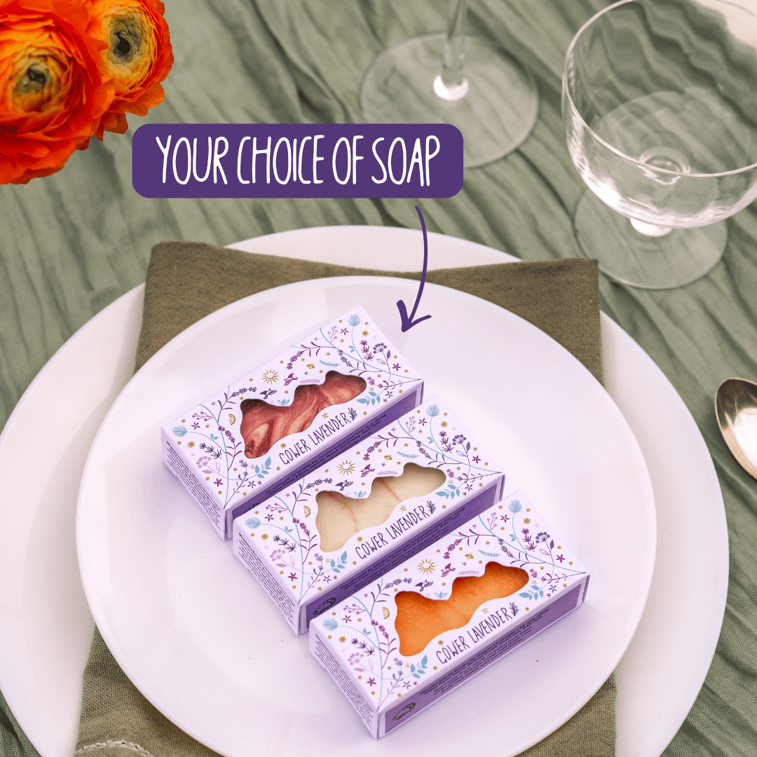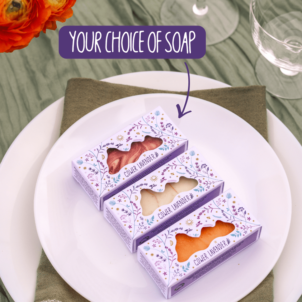 All ten of our soap varieties are available to order in wedding favour boxes, from best-sellers including Lavender, Lavender Rose and Lavender & Laver Seaweed to our limited edition Lavender Christmas Tree and Lavender Lemonade soaps.If you’d like a mix of different soaps, choose the ‘mix it up’ option and let us know how many of each variety you’d like by leaving us a message in the comments box when you get to the checkout.