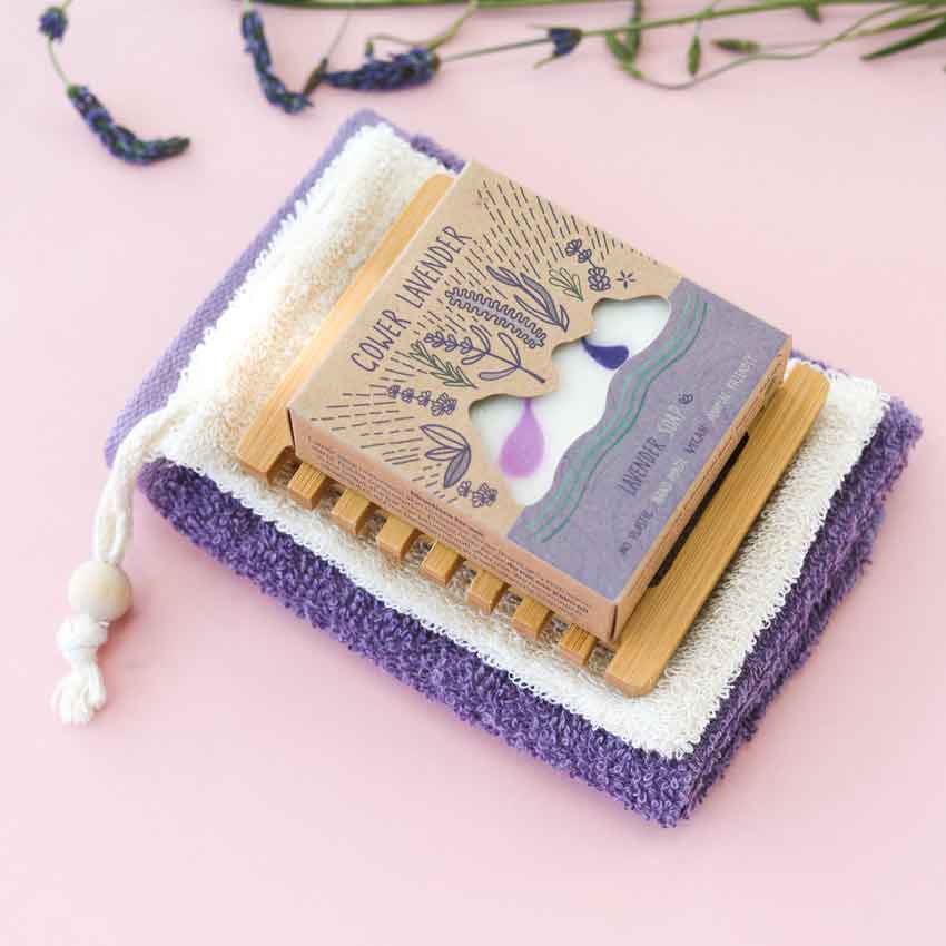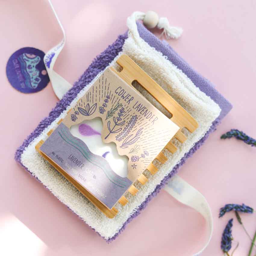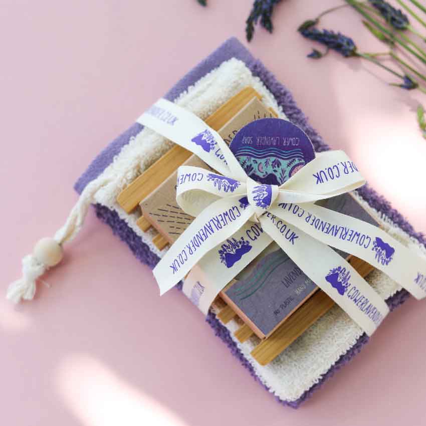Spoil yourself, or someone special, with this lavender gift set that includes a bar of our luxury lavender soap, a wooden soap dish, a soft muslin face cloth and an exfoliating scrub pouch.